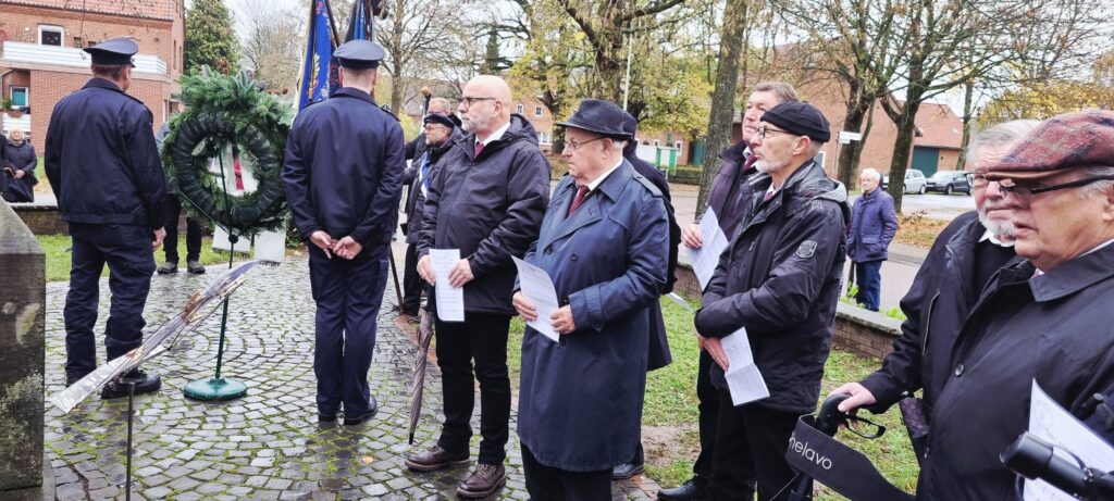 Anschließend wurde am Kriegerdenkmal, bei feinen Nieselregen, den gefallenen Soldaten der zwei Weltkriege mit einer Ehrenwache der freiwilligen Feuerwehr, einer Ansprache durch Friedhelm Weber (Seemannsverein) und einer gemeinsamen Kranzniederlegung durch Andreas Brokmeier (Ortsvorsteher) und Bernd Müller (Kulturgemeinschaft) gedacht.